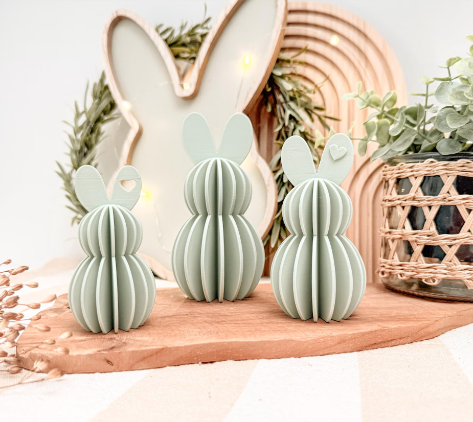 Velikonoční zajíčci ve skládaném vzhledu jsou navrženi tak, aby působili lehce, elegantně a přitom hravě. Malá jarní dekorace, která ožije přímo na vašem stole, poličce nebo parapetu a přivolá jaro do Vašeho domova.