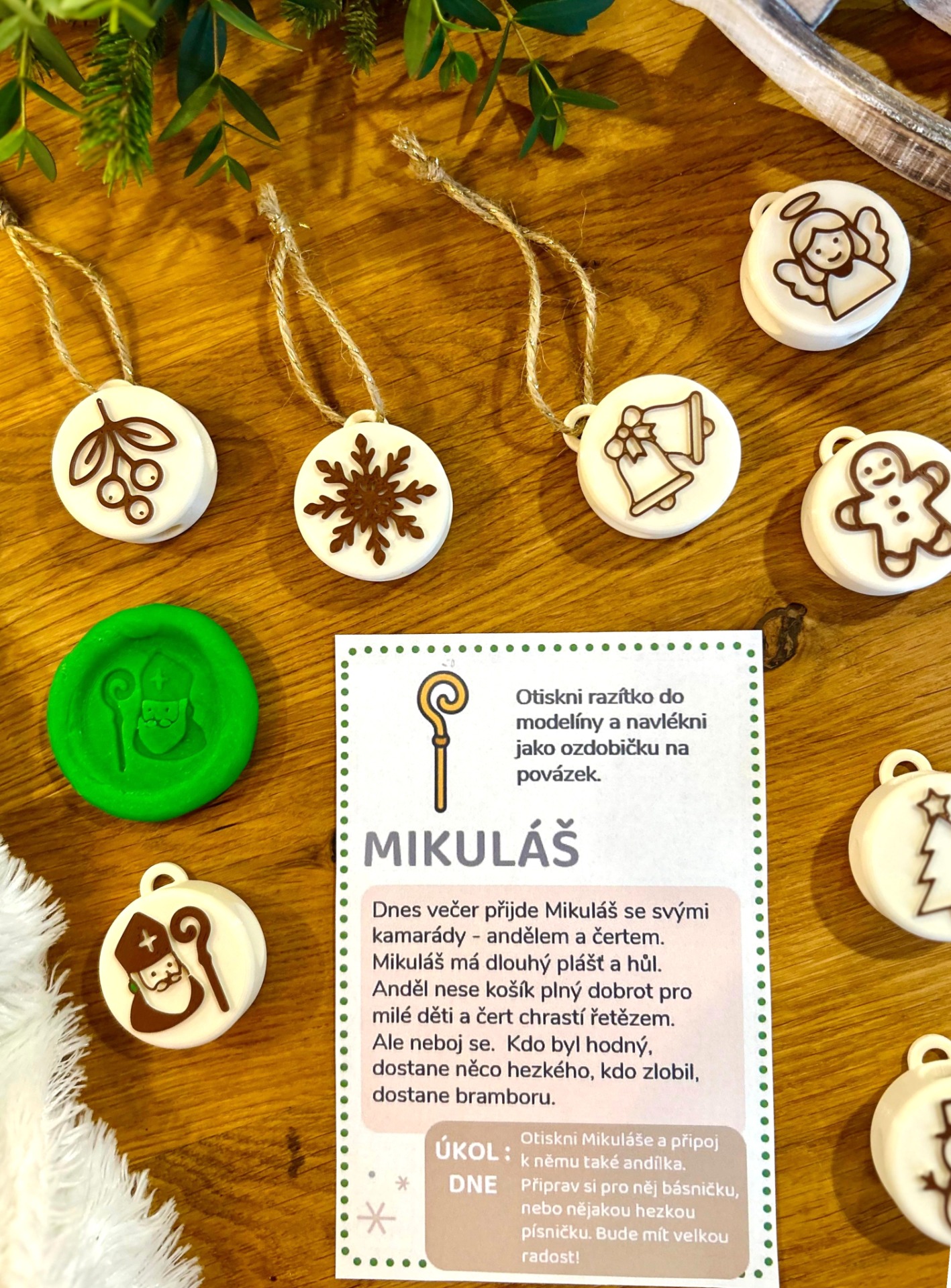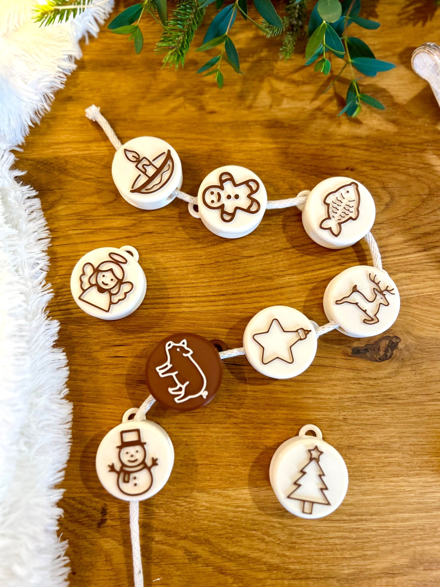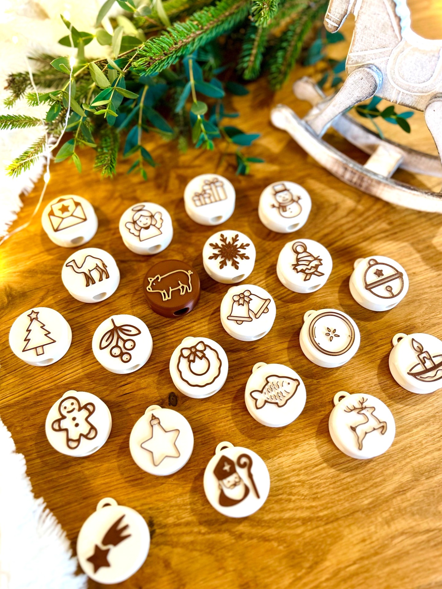 24 tematických razítek vyrobených z ekologických materiálů (PLA) technologií 3D tisku – každý den jedno, inspirované českými vánočními symboly (např. perníček, jmelí, kometa, betlém, zlaté prasátko…)